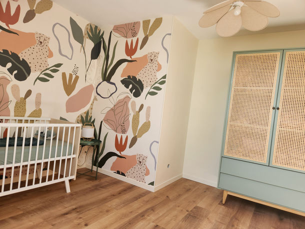 Un papier peint panoramique a été posé, ce qui apporte à la pièce toute son identitié.