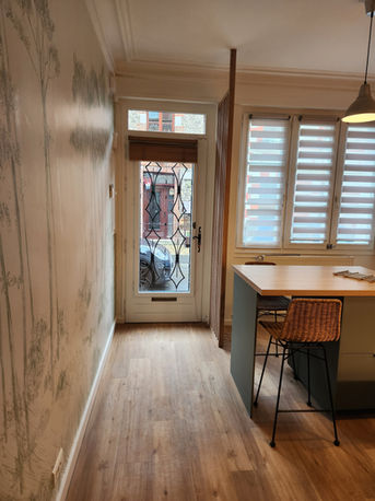 Pour moderniser l'ensemble, un sol PVC clipsable a été posé et un papier peint panoramique vient compléter l'ensemble pour apporter de la profondeur à la pièce.